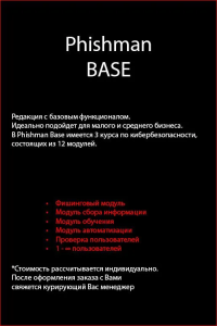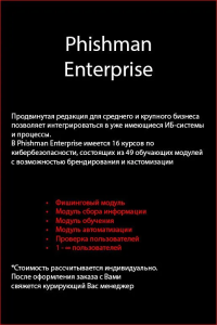Phishman Enterprise — расширенная редакция платформы, предназначенная для крупных компаний и организаций с высокими требованиями к информационной безопасности. В версии Enterprise доступны продвинутые инструменты моделирования фишинговых атак, глубокой аналитики, обучения персонала и автоматизации процессов киберзащиты. Решение позволяет выстраивать зрелую киберкультуру, минимизировать человеческий фактор и обеспечить устойчивость компании к современным угрозам.