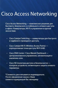 Cisco Access Networking — это комплексная экосистема решений для построения современного, безопасного и высокопроизводительного сетевого доступа в организациях любого масштаба. Платформа объединяет в себе проводные и беспроводные технологии, интеллектуальное управление и мощные инструменты безопасности, создавая единую, гибкую и полностью контролируемую сетевую инфраструктуру.