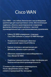 Cisco WAN — это комплексная платформа для построения безопасных, высокопроизводительных и масштабируемых корпоративных сетей. Решение объединяет SD-WAN, интеллектуальную маршрутизацию, оптимизацию облачных подключений и централизованное управление, обеспечивая стабильную работу филиалов, дата-центров и многооблачных сред. Cisco WAN помогает ускорить приложения, повысить контроль над сетью, автоматизировать рутинные операции и обеспечить надёжную защиту трафика на всех участках распределённой инфраструктуры.