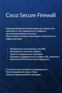 Cisco Secure Firewall легко внедряется в существующую сеть, поддерживает безопасный VPN-доступ, масштабируется под нужды бизнеса и управляется через удобную централизованную консоль. Подходит для компаний любых размеров, которым требуется надёжная защита данных, сетей и пользователей.