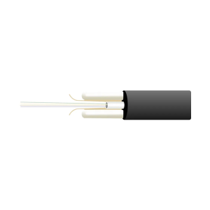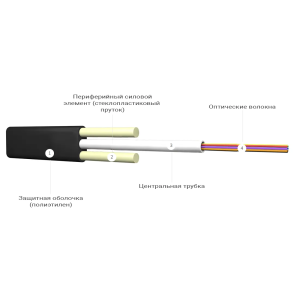 Данная конструкция кабеля состоит из одного оптического модуля натурального цвета. Модуль заполнен гидрофобным заполнителем. Параллельно с модулем располагаются две водоблокирующие нити и два стеклопластиковых прутка. Защитная оболочка выполнена из полиэтилена высокой плотности.