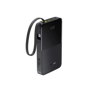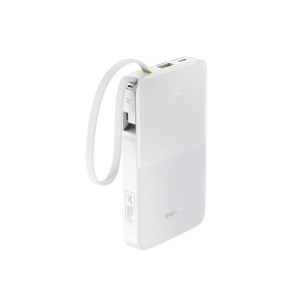 Внешний аккумулятор ёмкостью 10000 mAh с поддержкой быстрой зарядки до 22.5 W. Оснащён встроенным плетёным кабелем USB-C и цифровым дисплеем для отображения уровня заряда в процентах. Подходит для повседневного использования и поездок.