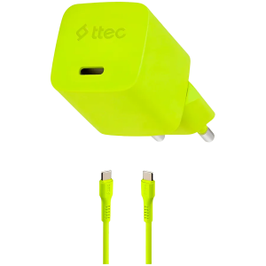ttec SmartCharger GAN 20W PD Travel Fast Charger + USB-C - USB-C 3A Cable 120cm, Neon Yellow