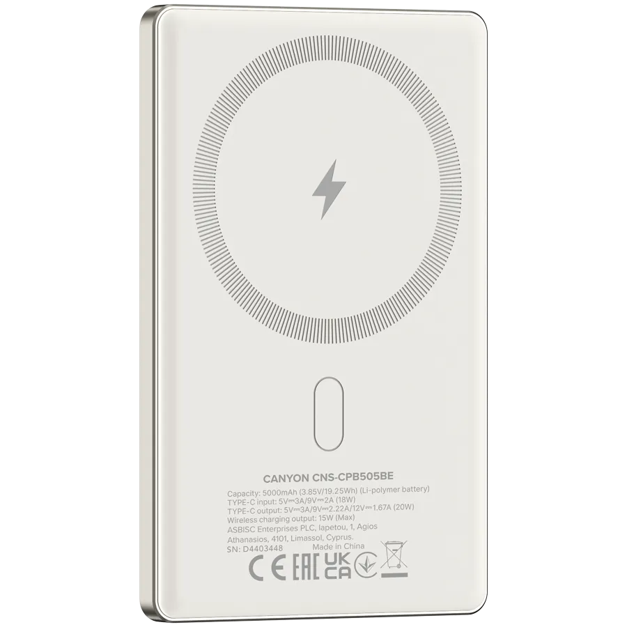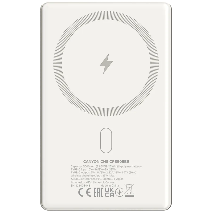 CANYON power bank OnPower 505 slim Magnetic 5000 mAh PD20W Beige