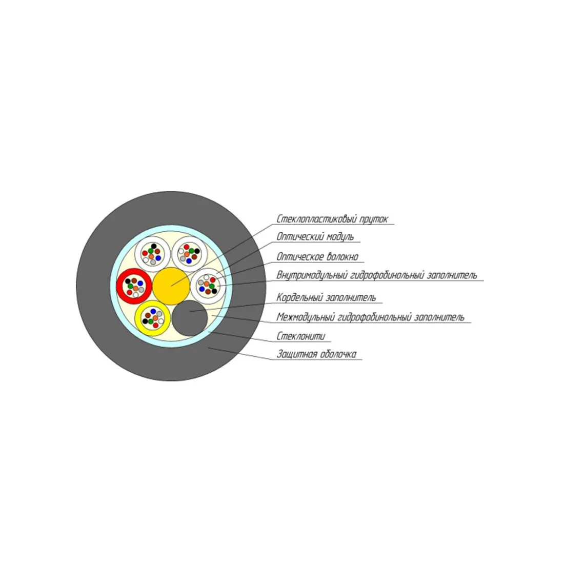 Кабель содержит сердечник модульной конструкции с центральным силовым элементом из стеклопластикового прутка, вокруг которого скручены оптические модули методом правильной SZ- скрутки вокруг центрального силового элемента – стеклопластикого прутка. Внутри оптических модулей свободно уложены оптические волокна. Свободное пространство внутри оптических модулей и межмодульное пространство заполнено гидрофобным заполнителем. Сердечник скреплен нитями. На сердечник наложена ПЭТ-лента, закрепленная нитью. Поверх сердечника накладывается оболочка из полиэтилена высокой плотности.