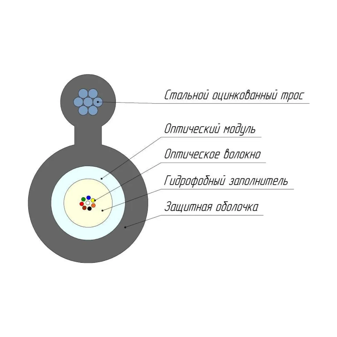 Кабель состоит из сердечника-модуля из ПТБ. Внутри оптического модуля свободно уложены оптические волокна. Свободное пространство внутри оптического модуля заполнено гидрофобным заполнителем. Несущий элемент расположен продольно к сердечнику. Одновременно поверх сердечника и несущего элемента накладываются оболочки. Оболочки сердечника и несущего элемента соединены вдоль общей образующей и выполнены из полиэтилена высокой плотности. При количестве волокон более 12 для идентификации используется кольцевая покраска и/или группирование в пучки с помощью идентификационных нитей.
