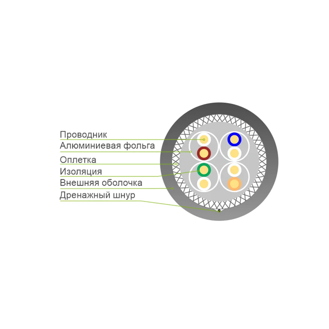 Это дважды экранированный (S-FTP) 4-х парный кабель 6-А категории. Защищён внешним экраном из медной оплетки плюс к этому каждая пара заключена в дополнительный отдельный экран. Двойной экран сводит к нулю уровень электромагнитного излучения кабеля и в несколько раз повышает защищённость от внешних помех. Используется при очень высоком уровне внешних наводок (производственные помещения) или при сверхвысоких требованиях к информационной безопасности. В отличии от кабеля 5e категории имеет жилу 0,56 мм. что позволяет работать на частоте 500 Мгц. Также по стандарту 6а категории, каждая пара имеет свой шаг скрутки. Кабель имеет стандартную PE оболочку, применяется при прокладке вне помещений.