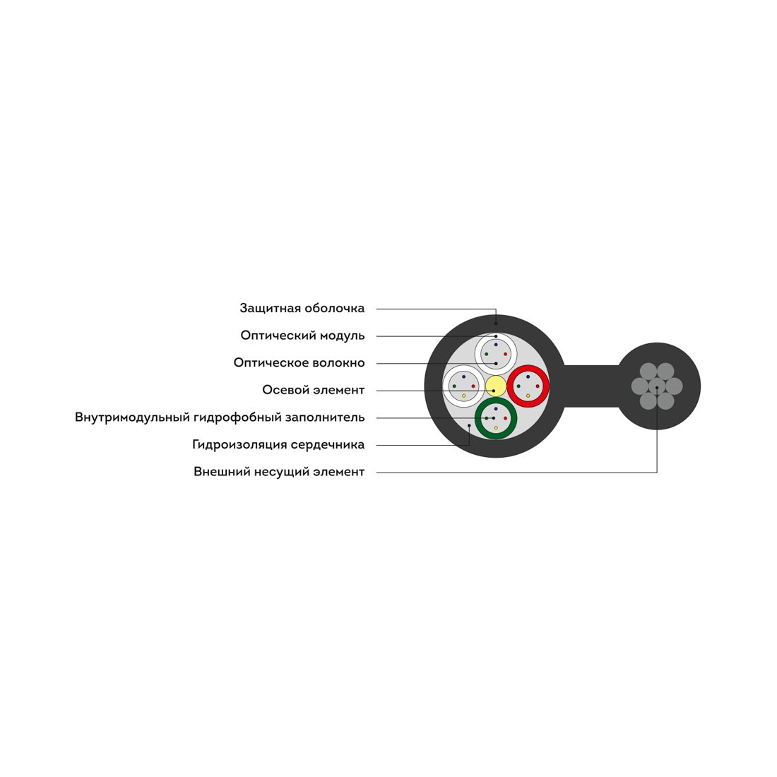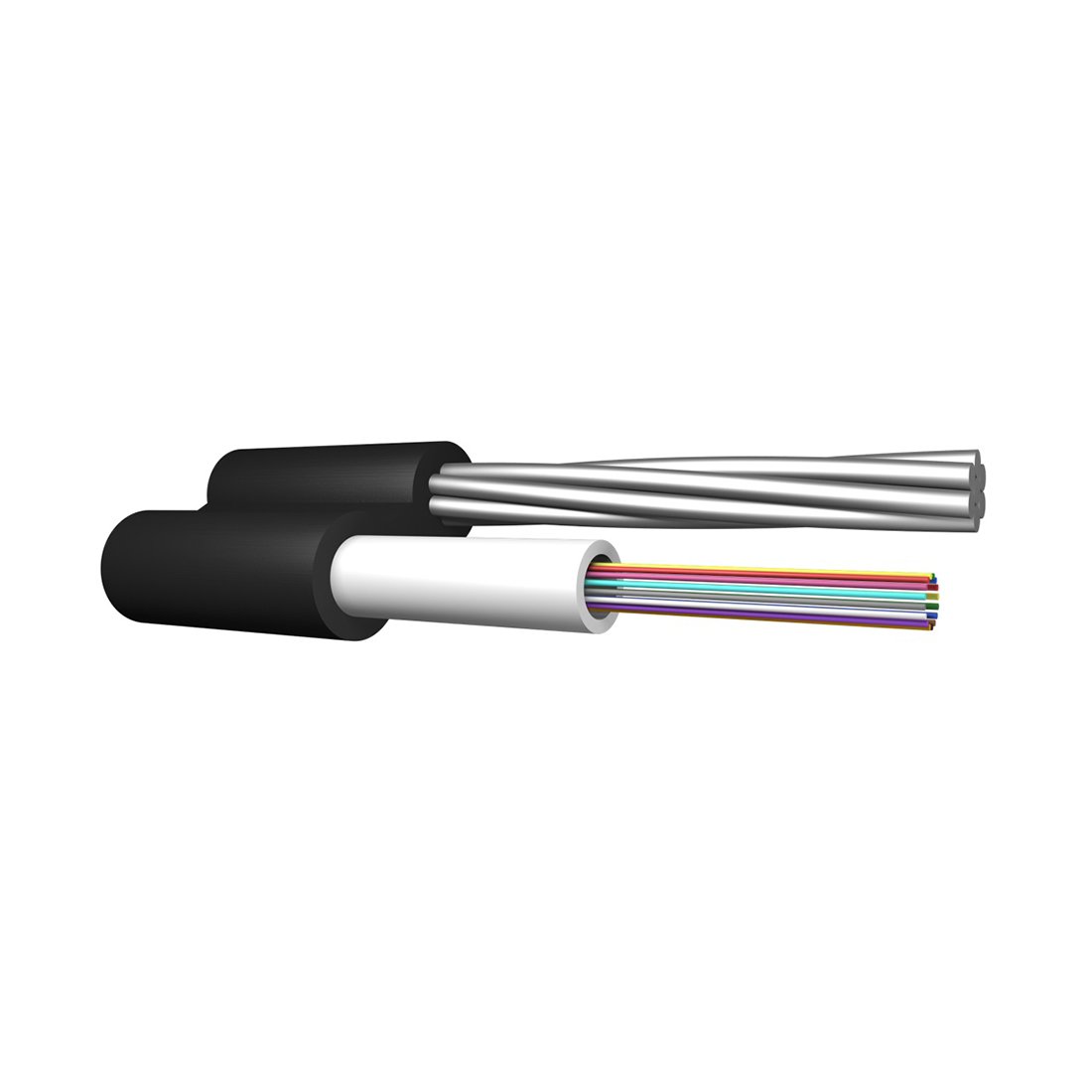 Подвесной оптический кабель имеет форму восьмерки. В верхней части конструкции располагается стальной трос, пруток из стеклопластика или проволока, а в нижней – оптический элемент. Обе части покрыты высокоплотным полиэтиленом и соединены друг с другом в единое целое.