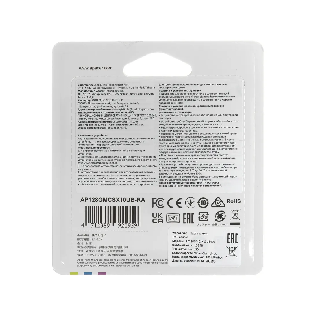 Карта памяти Apacer AP128GMCSX10UB-RA 128GB