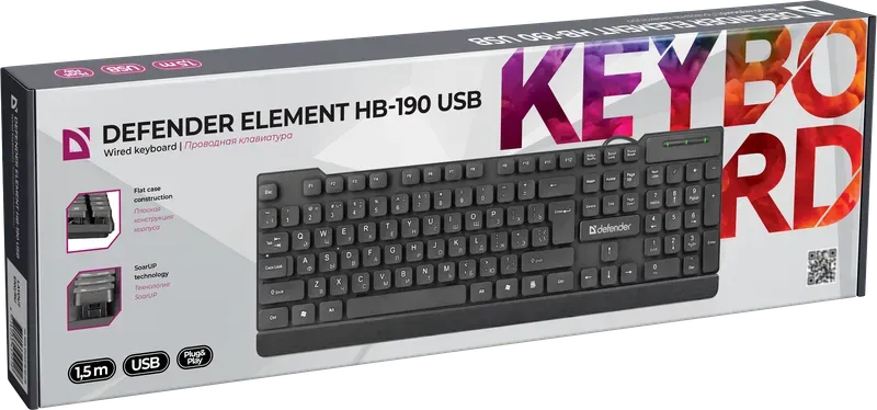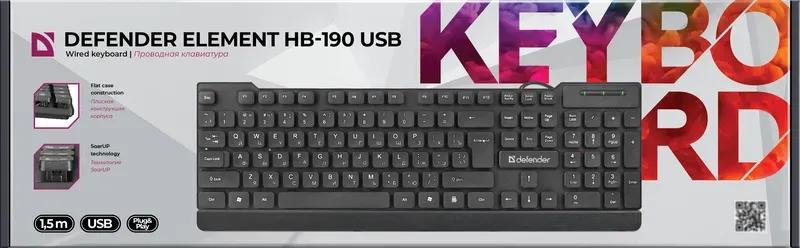 Клавиатура Defender Element HB-190 представлена в классическом черном дизайне пластикового корпуса. Мембранная конструкция оснащена 107-ю клавишами, включая отдельный цифровой блок и три дополнительные кнопки для управления питанием ПК. Предусматривается наличие эффективной защиты от брызг и попадания капель воды на механизм. Полноразмерное устройство Defender Element HB-190 островного типа позволяет самостоятельно регулировать угол наклона рабочей области. Подключение к компьютеру осуществляется при помощи кабеля длиной 1.5 м с разъемом USB. Питание клавиатуры осуществляется по шине.