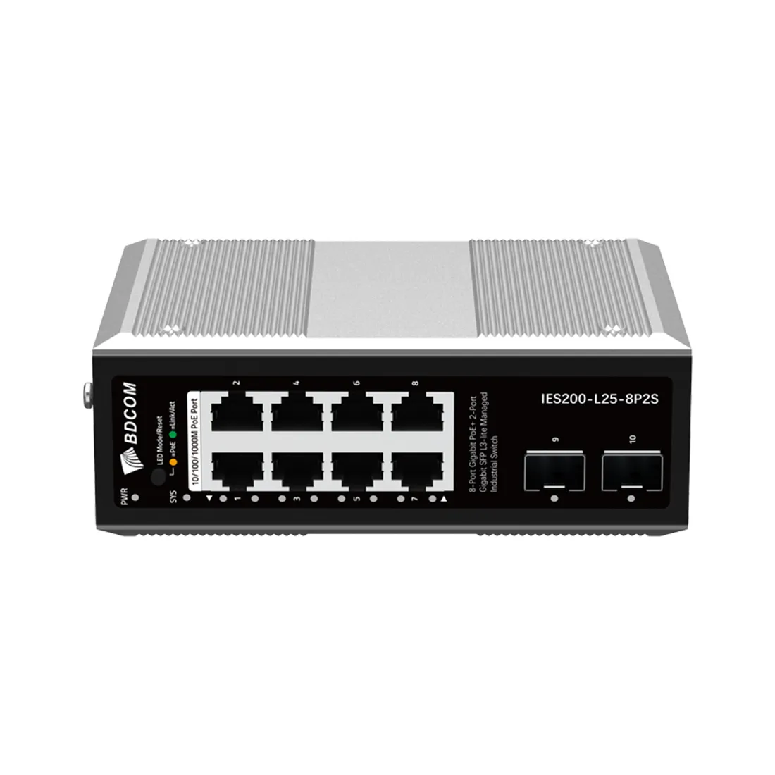 Коммутатор BDCOM IES200-L25-8P2S - это промышленный PoE-коммутатор с поддержкой L3-lite. Оснащен 8 портами 10/100/1000 RJ45 с поддержкой PoE+ и 2 портами SFP. Коммутатор имеет компактный дизайн и защиту по стандарту IP40.