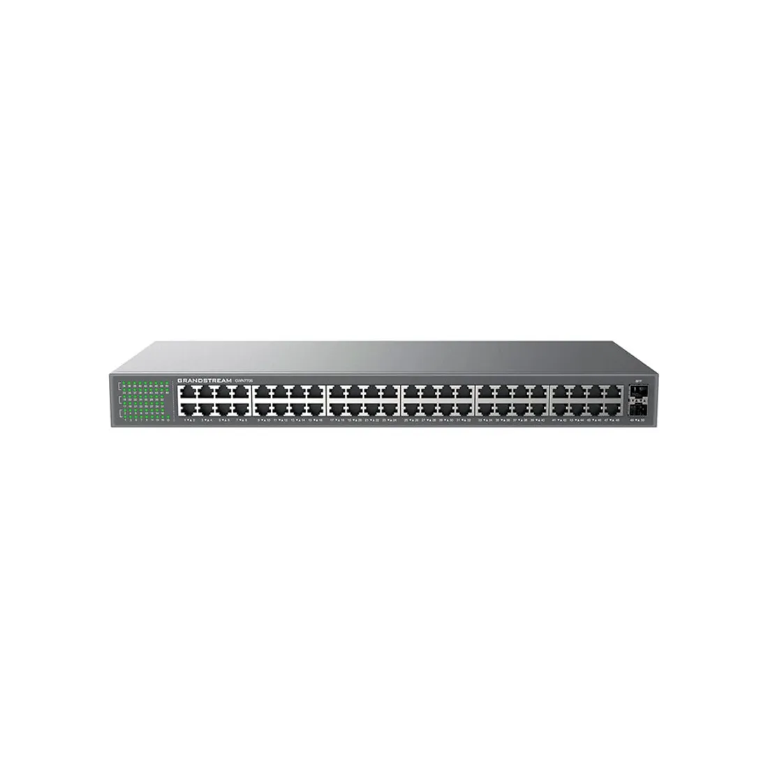 Grandstream GWN7706 — это неуправляемый сетевой коммутатор с 48 гигабитными портами RJ-45 и 2 оптическими SFP-портами для uplink, предназначенный для быстрого расширения проводной сети в офисах, учебных и коммерческих помещениях, а также в сетях малого и среднего бизнеса. Устройство работает в режиме plug-and-play, не требует настройки и обеспечивает стабильную пропускную способность для всех подключённых устройств.