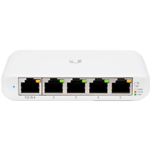 Ubiquiti USW Flex Mini 5-Port managed Gigabit Ethernet switch powered by 802.3af/at PoE or 5V, 1A USB-C power adapter.
