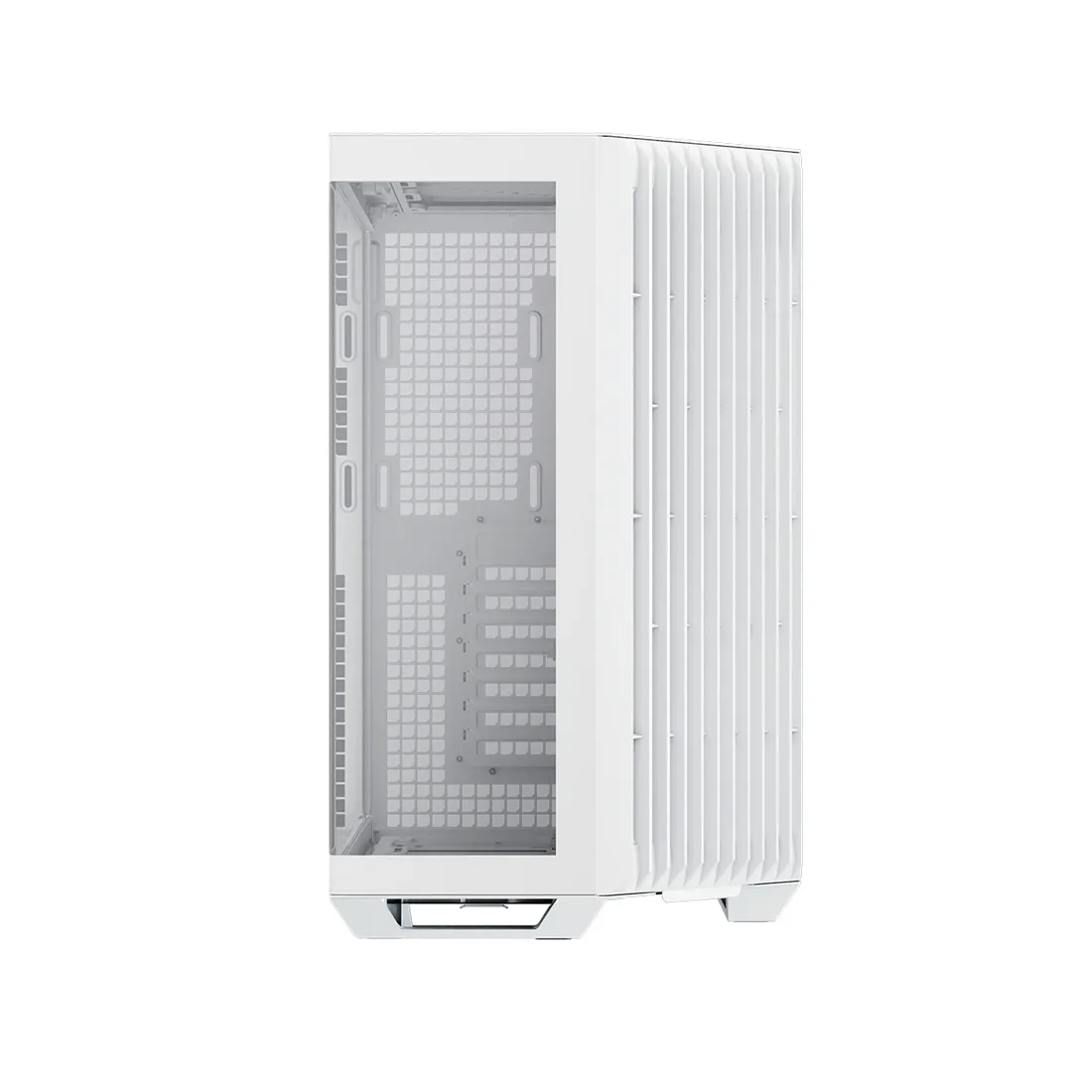 Этот инновационный дизайн в двухкамерной панорамной конструкции корпуса имеет угловой впускной патрубок 45°, который улучшает общий воздушный поток и тепловую эффективность как для графического процессора, так и для центрального процессора, сохраняя при этом фирменный вид из полностью закаленного стекла. Угловая впускная панель поддерживает три 12-сантиметровых, два 14-сантиметровых и до двух 16-сантиметровых вентиляторов.