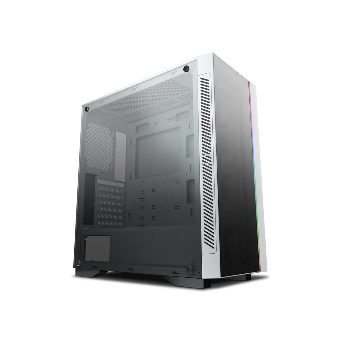 Стильный белый корпус в классическом исполнении в виде правильной призмы, с двух сторон панели из закаленного стекла, компактный размер, но при этом очень вместительный. В комплекте три тихих эффективных вентилятора с RGB-подсветкой плюс светодиодная лента на фронтальной панели.