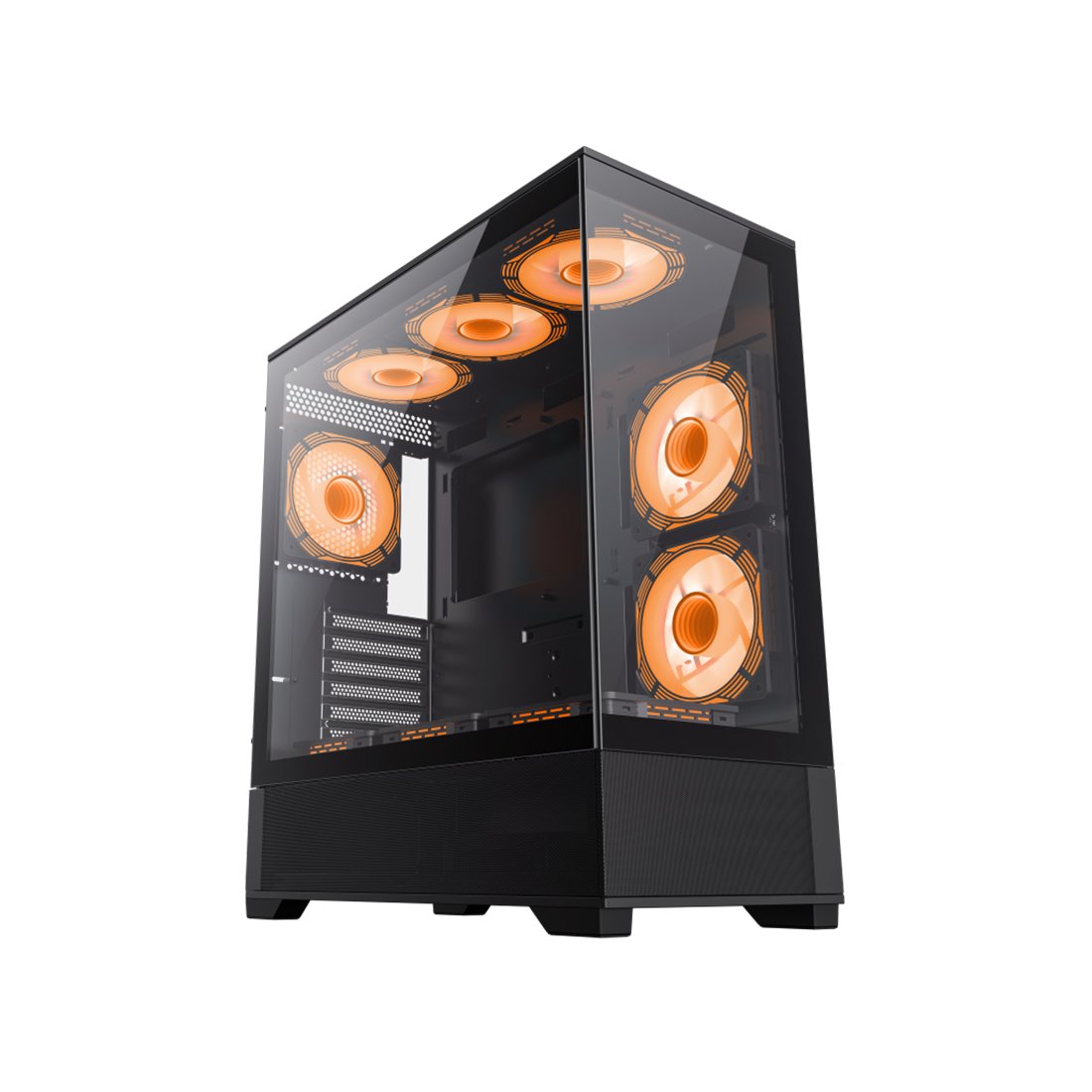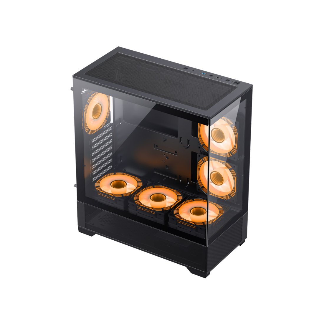 Основное внимание уделяется охлаждению- Модульный ввод/вывод материнской платы позволяет перемещать материнскую плату в верхнее/нижнее положение для систем с воздушным/водяным охлаждением. Чтобы обеспечить достаточный воздушный поток, предустановлен Total 6x120 мм ARGB (3x реверсивных и 3x передних вентиляторов, мелкоячеистая панель вверху и со стороны кожуха блока питания, помогает с отличной вентиляцией