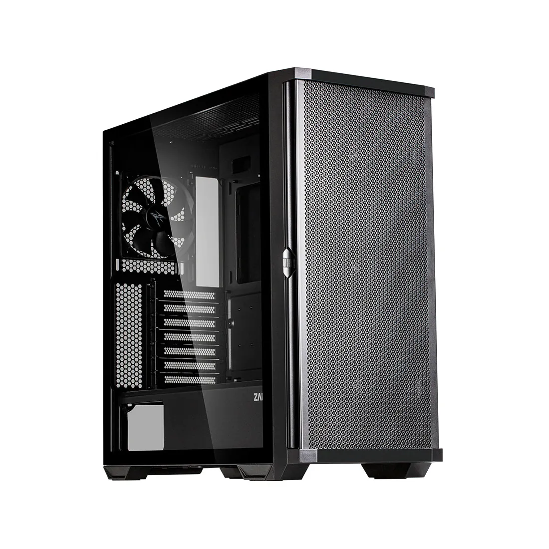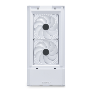 В корпусе установлены уже знакомые фронтальные вентиляторы ARGB и передняя светодиодная полоса с правой стороны, но сами вентиляторы заменены на три более современных модели размером 140 мм с поддержкой ШИМ спереди и вентилятор ARGB размером 120 мм сзади. Воздухопроницаемая сетчатая передняя панель позволяет системе полностью использовать возможности 140-миллиметровых фронтальных вентиляторов.