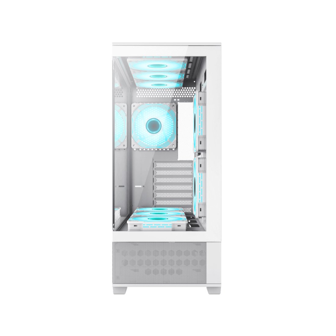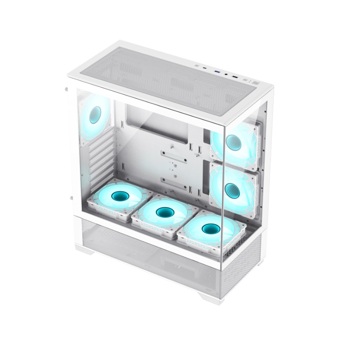 Для эффективного охлаждения предустановлено шесть 120-мм ARGB вентиляторов (три с прямым и три с обратным потоком воздуха). Дополнительно предусмотрена мелкая вентиляционная сетка на верхней панели и на кожухе блока питания.