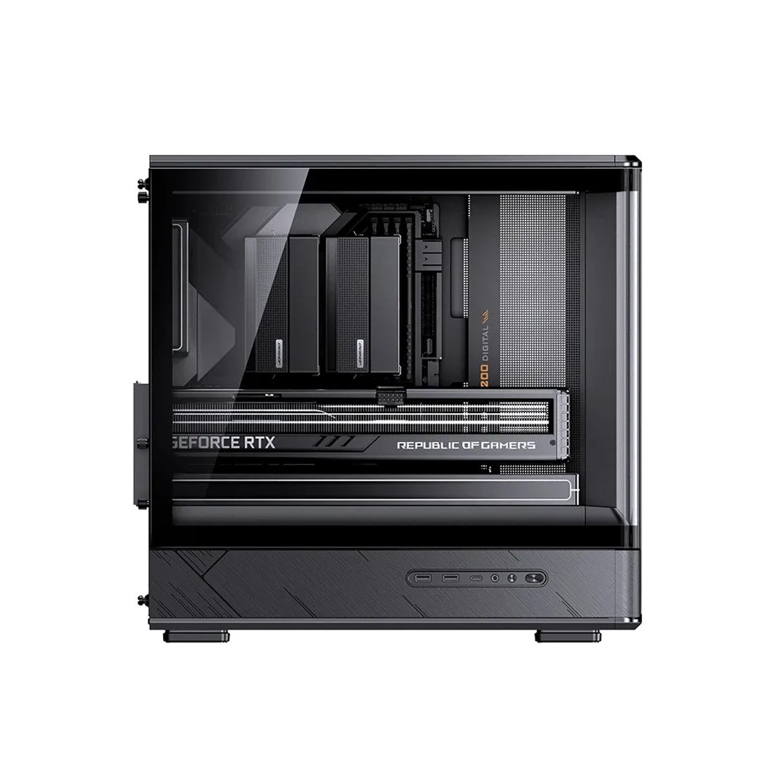 Перфорированная передняя панель — это очень функциональная функция, которая сочетается с эстетикой. Стильный дизайн по краям предлагает вам уникальность, с которой никто не может сравниться. Левая панель из закаленного стекла позволяет вам продемонстрировать вашу сборку во всей ее красоте.
