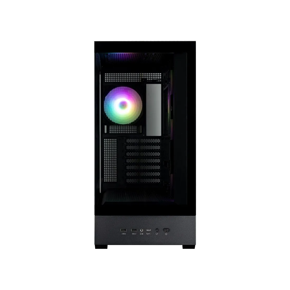 Инновационная конструкция в двухкамерном панорамном корпусе включает в себя воздухозаборник под углом 45°, который улучшает общий воздушный поток и тепловую эффективность как для видеокарты, так и для процессора, сохраняя при этом фирменный вид закаленного стекла. Угловая панель воздухозаборника поддерживает три 12-сантиметровых, два 14-сантиметровых и до двух 16-сантиметровых вентиляторов.