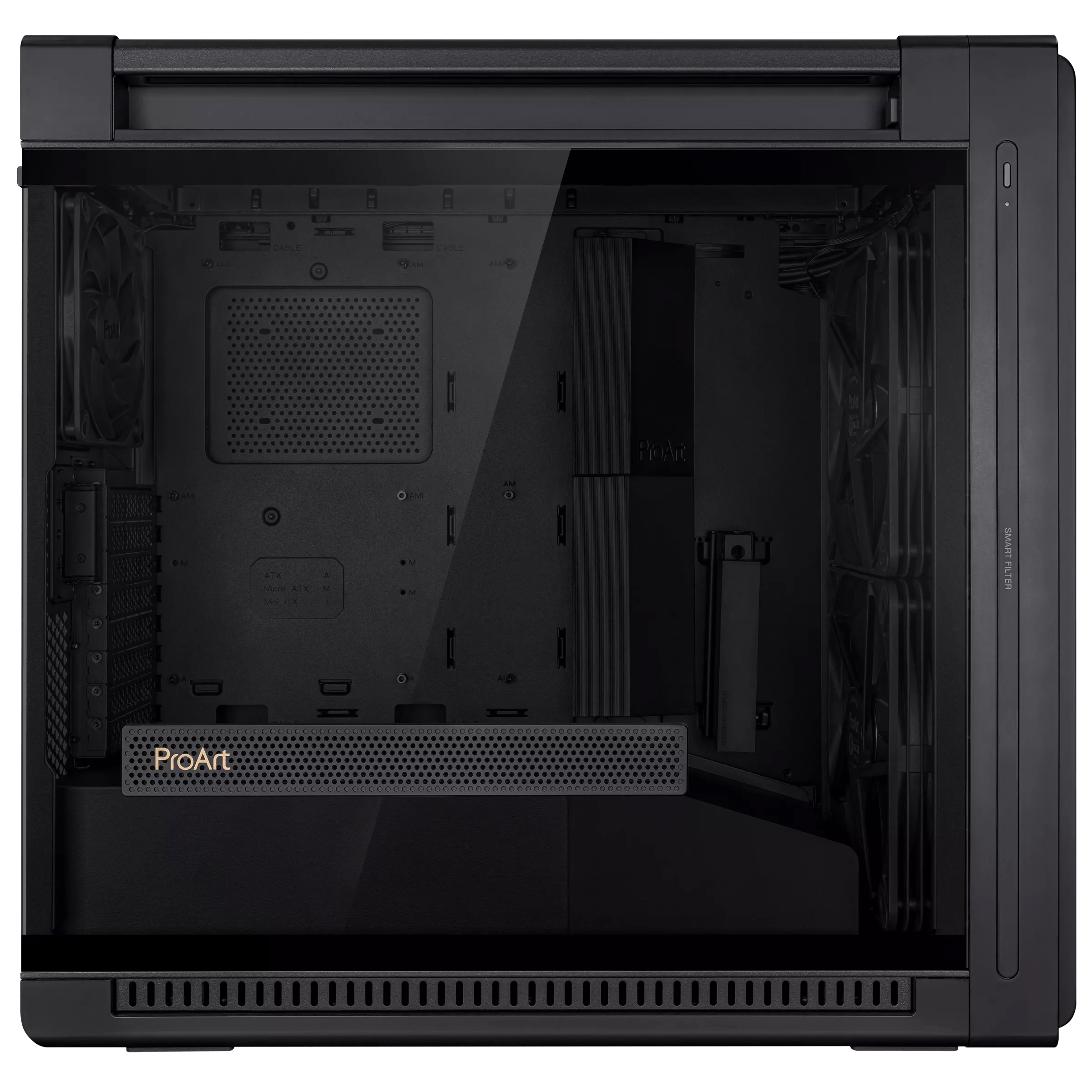 Корпус ProArt PA602, созданный для оптимального воздушного потока и улучшенного охлаждения, - мечта для творческих профессионалов, стремящихся к целенаправленному рабочему процессу. Благодаря передней панели, предназначенной для максимального забора воздуха, толстому предустановленному 140-мм заднему вентилятору и двум 200-мм передним вентиляторам, встроенному концентратору вентиляторов и поддержке 420-мм радиатора на верхней панели, он обеспечивает высококлассную производительность прямо из коробки. ProArt PA602 предназначен для тех, кто ищет высококлассные тепловые решения. А минималистичный дизайн позволяет творцам работать, не отвлекаясь на посторонние дела.