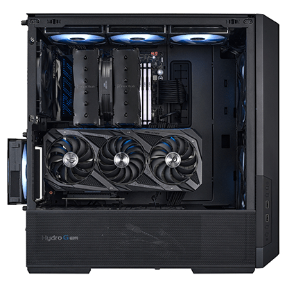 Для красивого и эффективного охлаждения начинки вашего компьютера в корпусе уже установлены 200-мм ARGB вентиляторы спереди и одним 120-мм ARGB вентилятором сзади. Благодаря ШИМ управлению, скорость вращения вентиляторов будет меняться в зависимости от температуры, это значит, что при низкой нагрузке уровень шума будет минимальным. Подсветкой же можно управлять при помощи встроенного контроллера с физической кнопкой, нажимай которую, можно выбрать желаемый световой профиль, либо переключится на управление контроллером материнской платы.