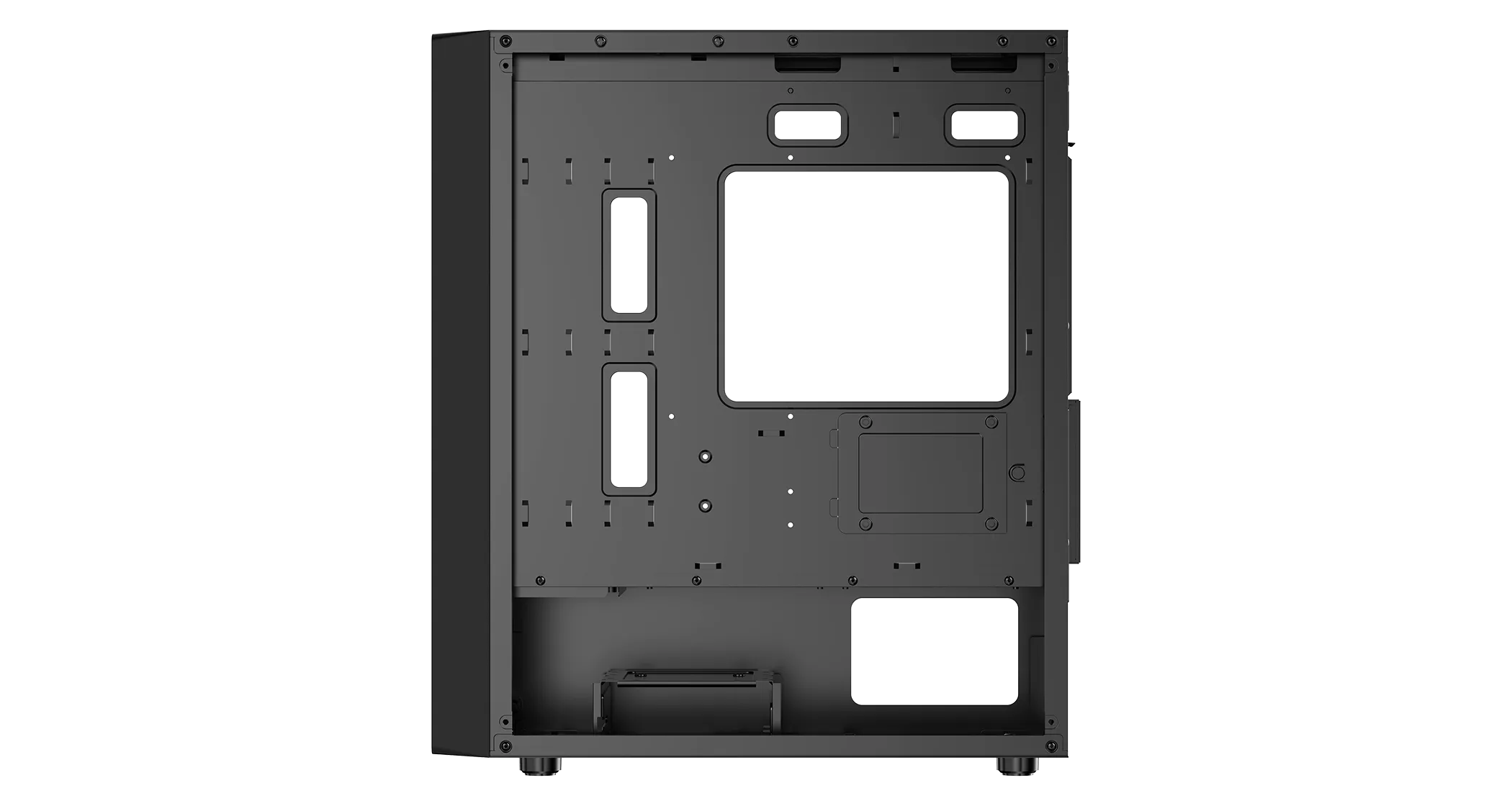 Чтобы получить доступ к внутренним узлам компьютера, пользователю не требуется применять вспомогательные инструменты. Возможность установки дополнительных вентиляторов позволяет обеспечить наиболее эффективное охлаждение внутренних элементов системного блока (3*120 мм фронт, 1*120 мм сбоку и 1*120 сзади),