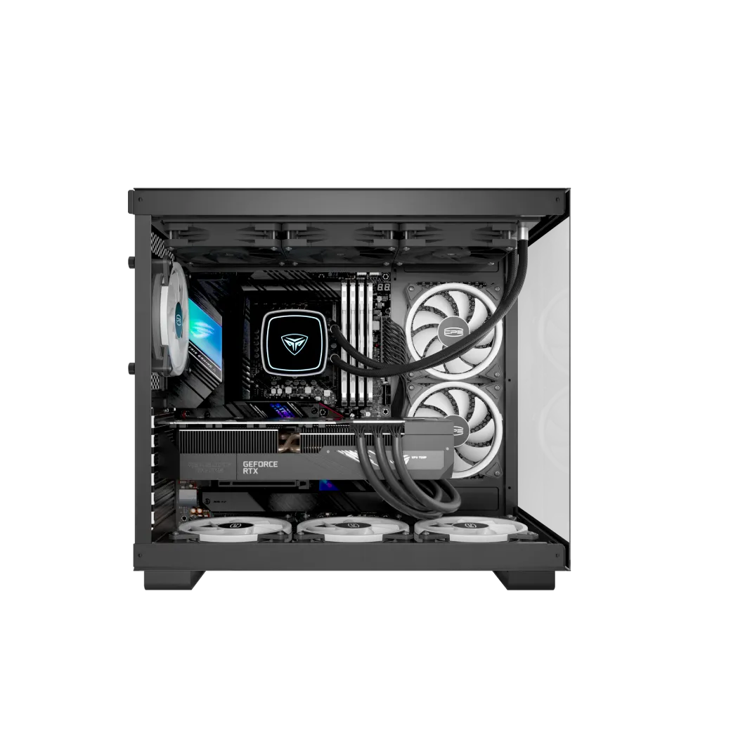 Корпус поддерживает установку до 8 RGB вентиляторов (включая 2 вентилятора 120 мм) и может быть оснащён различными конфигурациями водяного охлаждения, обеспечивая оптимальные температуры системы при высокой нагрузке и улучшая производительность в играх.