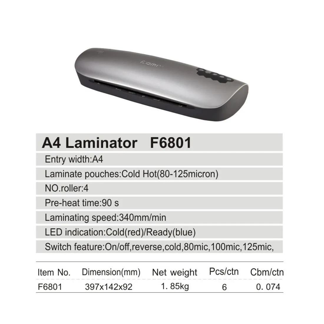 Корпус ламинатора не перегревается и безопасен при прикосновении. Ламинатор Comix F6801 позволяет надежно заламинировать документы, презентационные и рекламные материалы, фотографии, грамоты, рисунки, открытки, визитки, инструкции и многое другое.