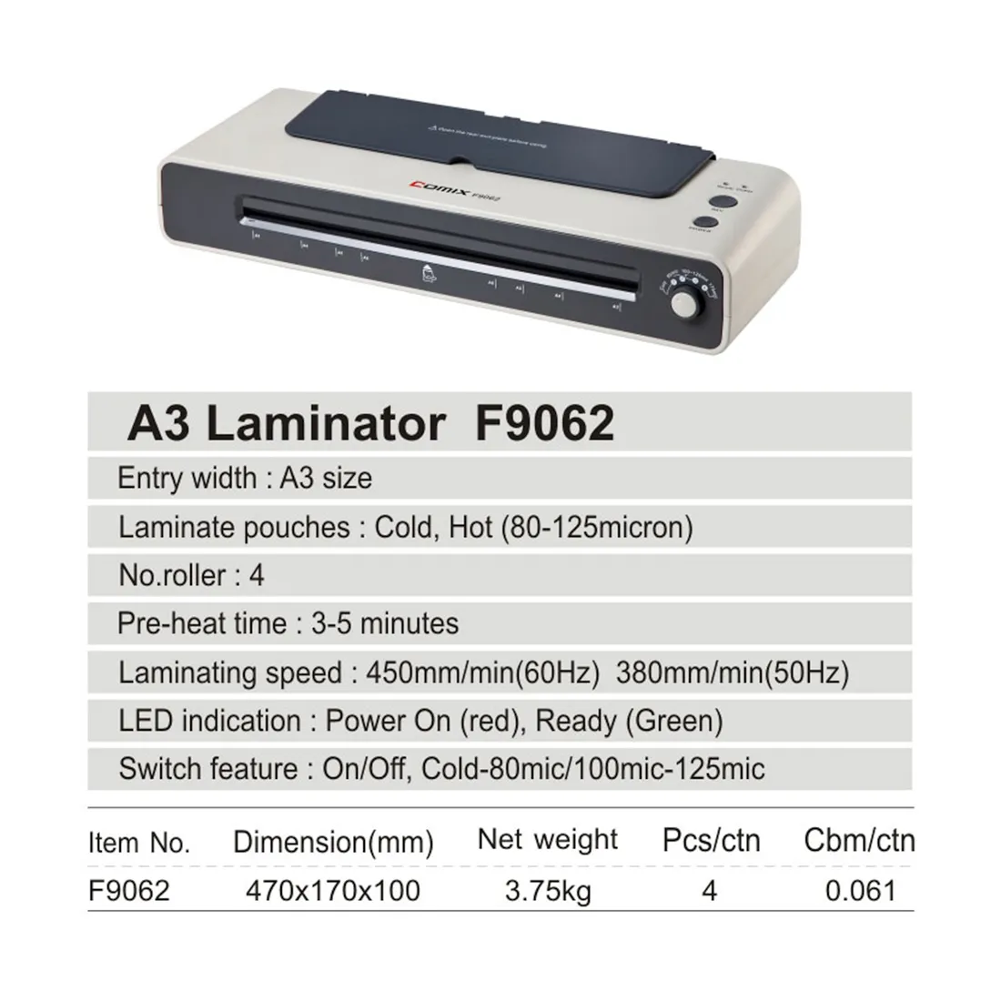 Корпус ламинатора не перегревается и безопасен при прикосновении. Ламинатор Comix F9052 позволяет надежно заламинировать документы, презентационные и рекламные материалы, фотографии, грамоты, рисунки, открытки, визитки, инструкции и многое другое.