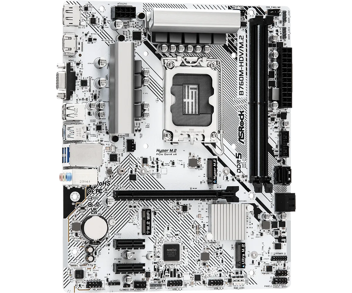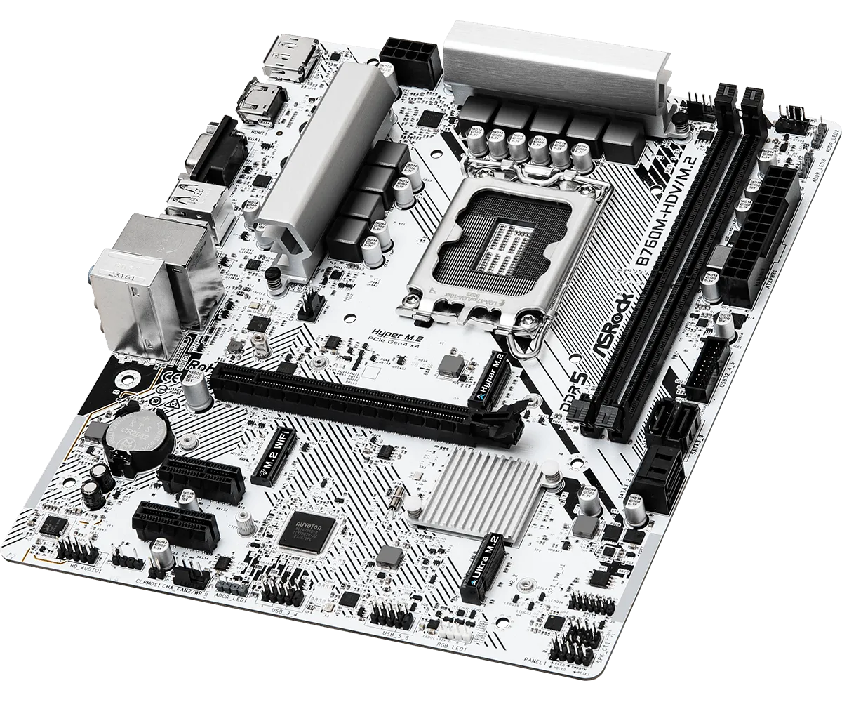 B760M-HDV/M.2 Supports 14th, 13th & 12th Gen Intel® Core™ Processors (LGA1700) 7+1+1 Power Phase Supports DDR5 7200MHz (OC) 1 PCIe 4.0 x16, 2 PCIe 3.0 x1, 1 M.2 Key E for WiFi Graphics Output Options: HDMI, DisplayPort, D-Sub Realtek ALC897 7.1 CH HD Audio Codec 4 SATA3, 1 Hyper M.2 (PCIe Gen4 x4), 1 Ultra M.2 (PCIe Gen3 x4) 1 USB 3.2 Gen1 Type-C (Rear), 5 USB 3.2 Gen1 Type-A (3 Rear, 2 Front), 6 USB 2.0 (2 Rear, 4 Front) Dragon 2.5G LAN Supports ASRock Auto Driver Installer