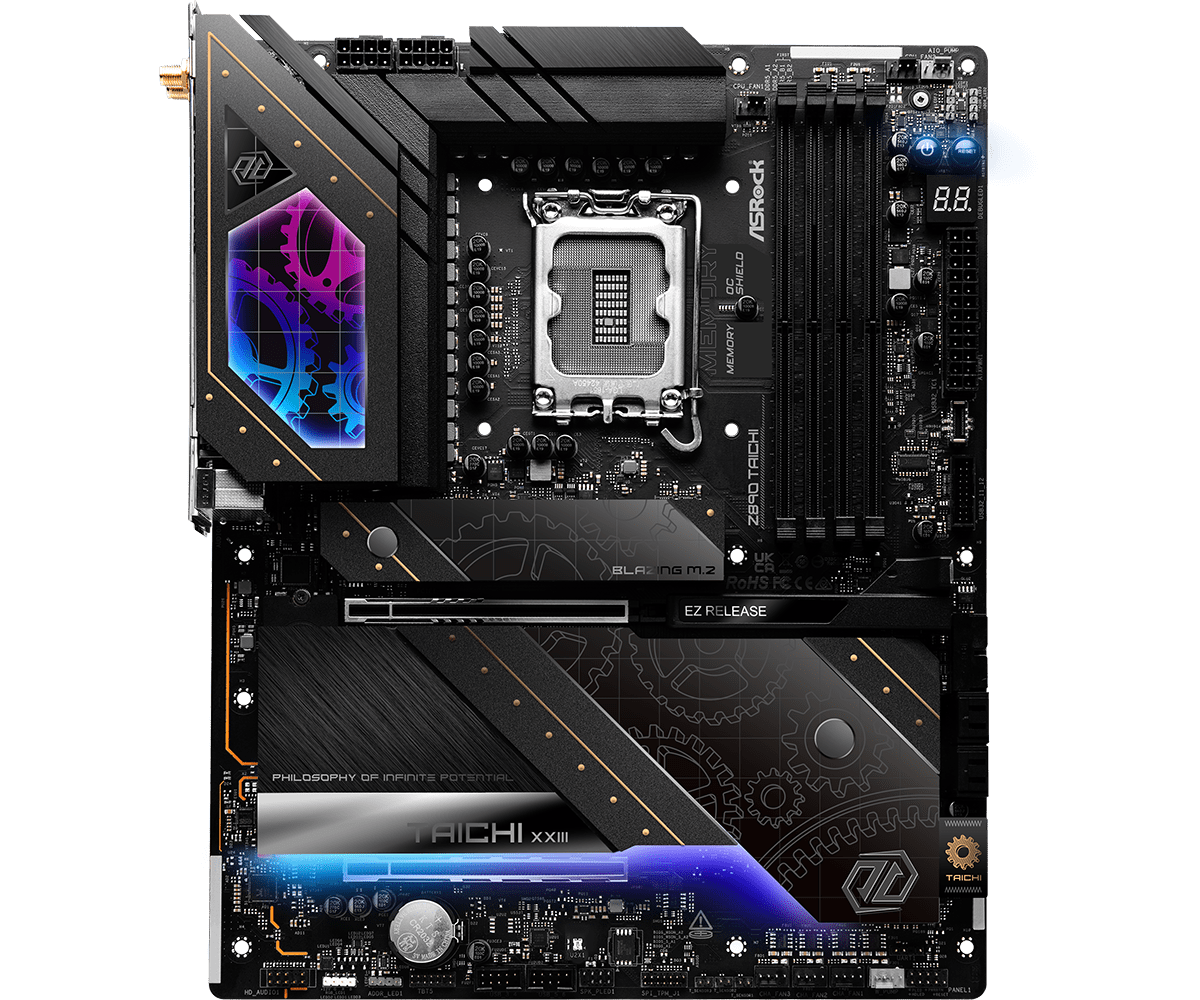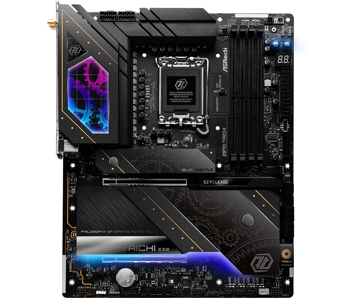 Z890 Taichi OCF – это вершина достижений ASRock в области экстремального оверклокинга. Эта материнская плата предназначена для самых крутых мастеров разгона, и отличается непревзойдённой точность, стабильностью и производительностью. И как истинный представитель Taichi, эта плата задаёт новые стандарты в своём сегменте. Z890 Taichi OCF Новая эпоха Taichi Флагманская линейка материнских плат ASRock получила существенные улучшения, и сочетает в себе водяное охлаждение, экстремальный разгон и передовые возможности во всех моделях Taichi. Среди флагманов стоит отметить серии «AQUA» и «OC Formula», представленные моделями Taichi AQUA с водяным охлаждением, Taichi OCF для экстремального разгона и безупречными Taichi и Taichi Lite. Эти трансформации меняют позиционирование плат на рынке. Теперь флагманские разработки ASRock предлагаются под брендом «Taichi», для компьютеров класса High-End. Такой подход существенно повышает узнаваемость бренда, и окончательно закрепляет за ним уровень для передовых со