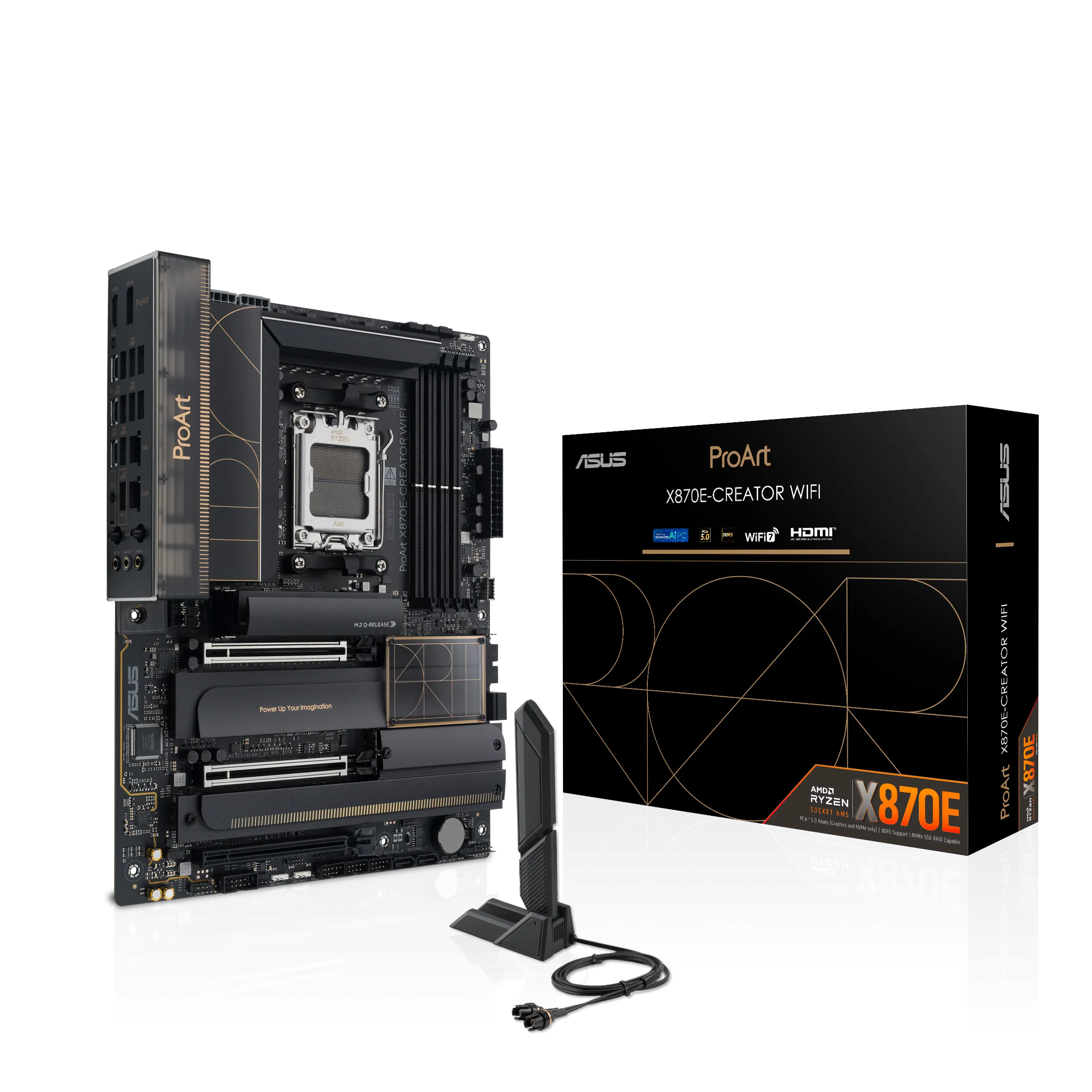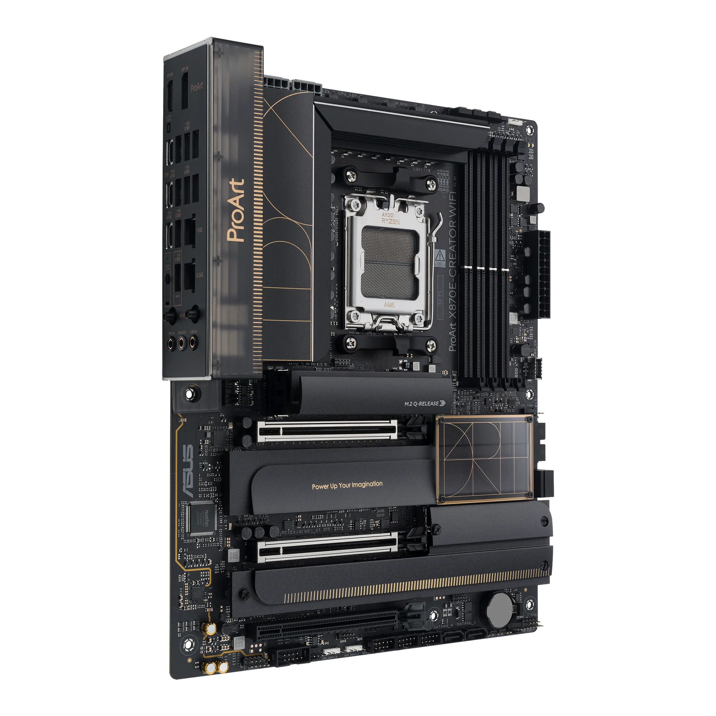 Материнская плата ProArt X870E-Creator WiFi расширяет возможности создателей контента любого уровня, максимально используя производительность новейших процессоров AMD Ryzen™ серий 9000, 8000 и 7000 с 16+2+2-ступенчатым блоком питания, слотами DDR5, PCIe® 5.0 и молниеносной скоростью подключения, включая два порта USB4®, Ethernet 10G и 2.5G, а также Wi-Fi 7. Эта материнская плата воплощает профессиональное, элегантное и точное видение для создателей контента всех типов, стиль которого подчеркивается многослойной черной отделкой с металлическими золотыми акцентами. Полупрозрачная крышка разъемов ввода/вывода также позволяет пользователям стильно рассмотреть высококачественные разъемы внутри.