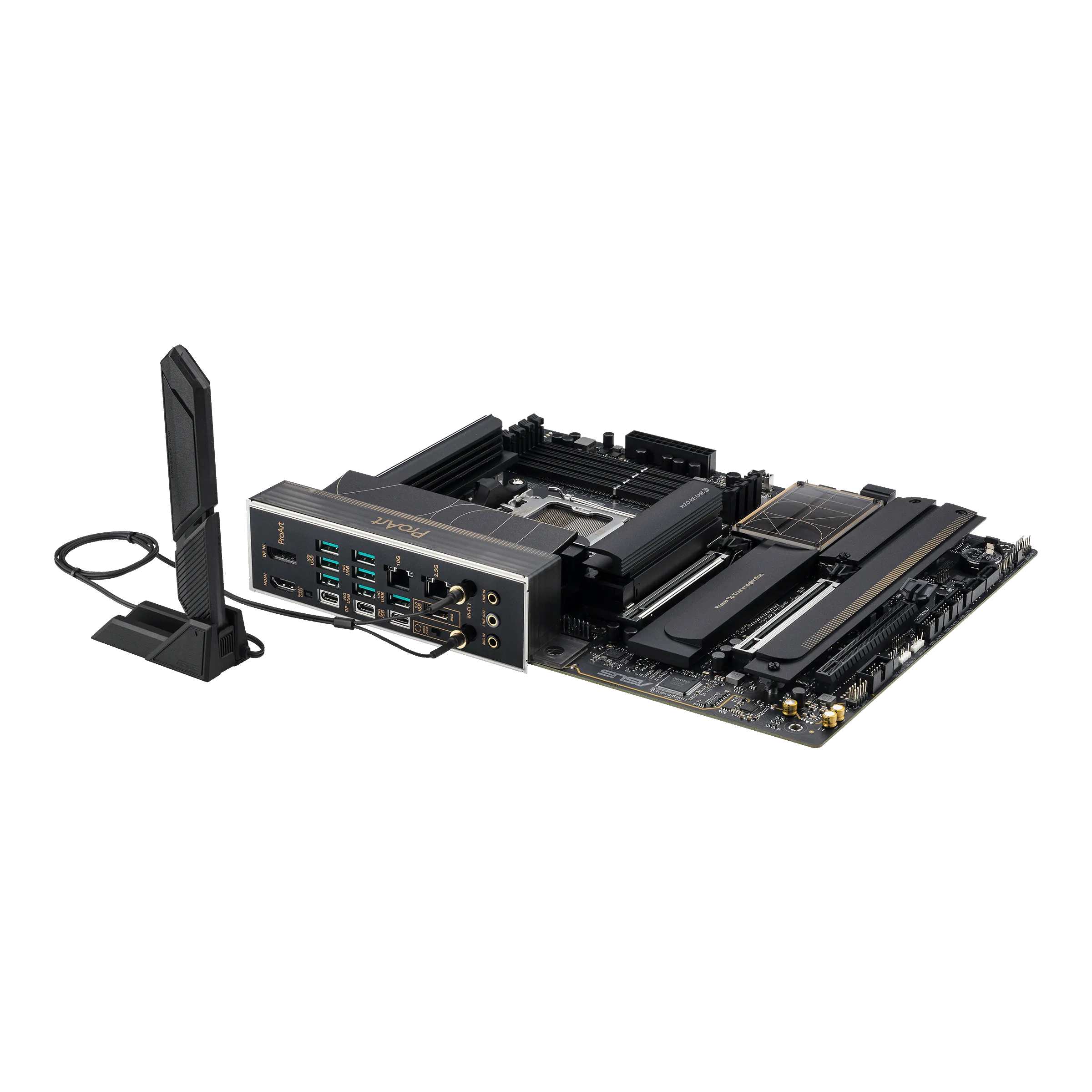 Материнская плата ProArt Z790-Creator WiFi станет отличным фундаментом для компьютера, предназначенного для запуска профессиональных приложений. Поддержка процессоров Intel Core 13-го и 12-го поколений, мощная система питания (16+1 силовой модуль), стандарты DDR5 и PCIe 5.0, скоростные интерфейсы (Thunderbolt 4 / USB4, 10G и 2.5G Ethernet, Wi-Fi 6E) – она предлагает все, что необходимо для продуктивной работы. Устройство выделяется элегантным, строгим дизайном, выполненном в черных тонах с золотистыми акцентами.