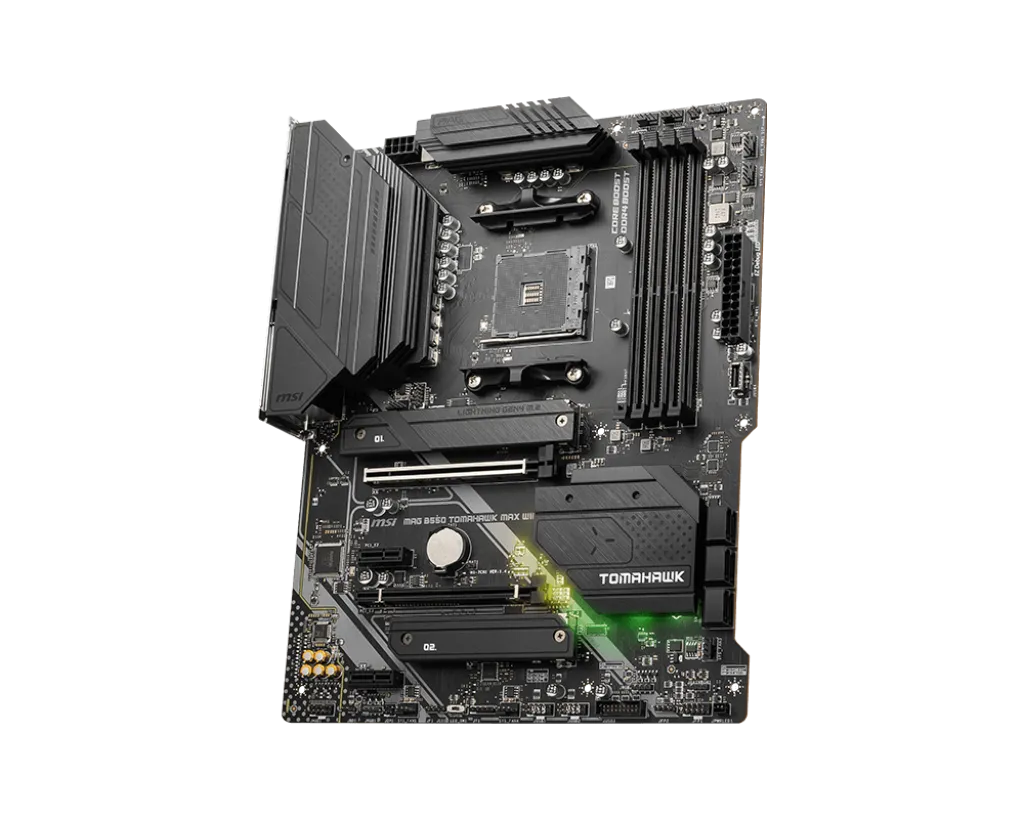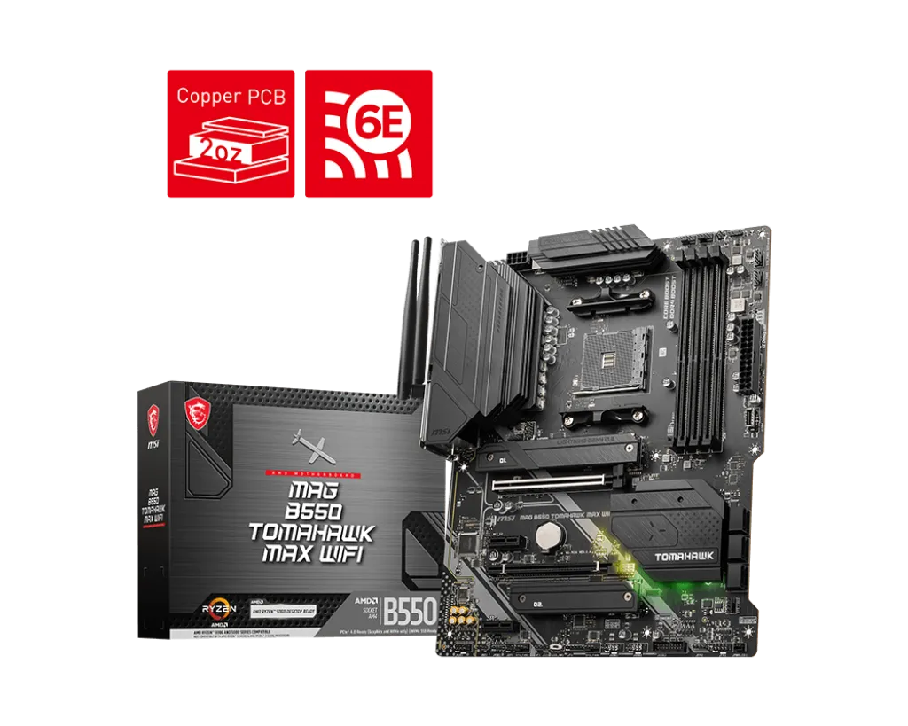 MAG B550 TOMAHAWK MAX WIFI Поддерживаются процессоры AMD Ryzen™ 5000 серии, 5000 G-серии, 4000G-серии и 3000 серии Поддержка памяти DDR4 с частотой до 5100+МГц (в режиме разгона) Высокоскоростные интерфейсы: PCIe 4.0, Lightning Gen 4 x4 M.2 with M.2 Shield Frozr, AMD Turbo USB 3.2 Gen 2 Эффективная система охлаждения: большой радиатор системы питания с дополнительной термопрокладкой с теплопроводностью 7 Вт/(м·K), печатная плата с увеличенным содержанием меди Мощная система питания: по схеме 10+2+1 Duet Rail, цифровой ШИМ-контроллер, Core Boost, DDR4 Boost Контроллеры 2.5G Ethernet и AMD Wi-Fi 6E предоставляют высокоскоростное и стабильное сетевое подключение для широкого спектра приложений Предустановленная панель ввода/вывода: защищает от электромагнитных помех и облегчает установку материнской платы Аудиосистема Audio Boost: высококачественное звучание, создающее неповторимую атмосферу в играх Поддержка многопроцессорных графических конфигураций Crossfire™, усиленные слоты PCIe с технологией Steel