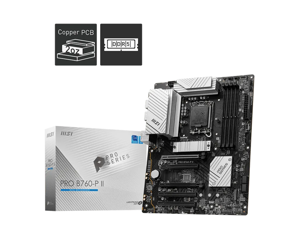 Материнская плата MSI PRO B760-P II поддерживает процессоры Intel® Core™ 14-го, 13-го и 12-го поколений, а также Pentium® Gold и Celeron® для разъёма LGA 1700. Поддерживает двухканальную DDR5-память с частотой до 7000+ МГц (OC). Оснащена усиленной системой питания 12+1 Duet Rail Power System с компонентами P-PAK, разъёмами питания 8-pin + 4-pin, технологиями Core Boost и Memory Boost для стабильной работы и разгона. Для эффективного охлаждения применяются увеличенные радиаторы, термопрокладки MOSFET с теплопроводностью 7W/mK, дополнительные термопрокладки на дросселях и M.2 Shield Frozr для защиты SSD от перегрева. Плата выполнена на 6-слойной PCB с утолщённой медью 2oz и материалами серверного уровня. Для максимальной производительности предусмотрены слот PCIe 4.0 и интерфейс Lightning Gen 4 x4 M.2. Технология Intel Turbo USB 10Gbps обеспечивает стабильное и быстрое подключение внешних устройств, а 2.5G LAN гарантирует высокую скорость и надёжность сетевого соединения. Аудиосистема Audio Boost обеспечивает к
