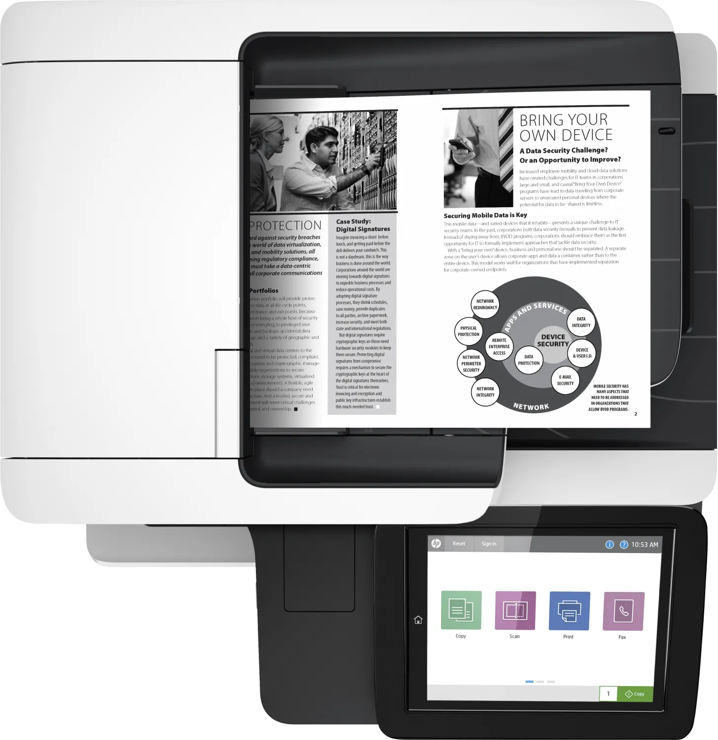 • Гарантия безопасности. Многоуровневая защита документов, устройств и сети с помощью шифрования данных, защиты от взлома и двухфакторной аутентификации пользователя.