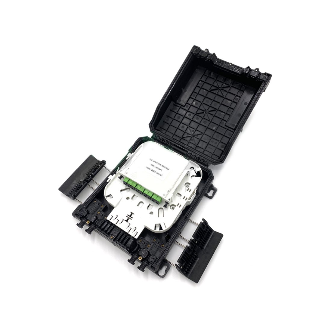 • Размещение PLC-сплиттеров (без корпуса): 1× 1:8 или 2× 1:4, габариты — 60×7×4 мм