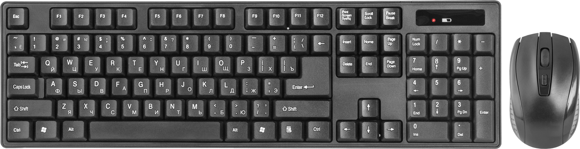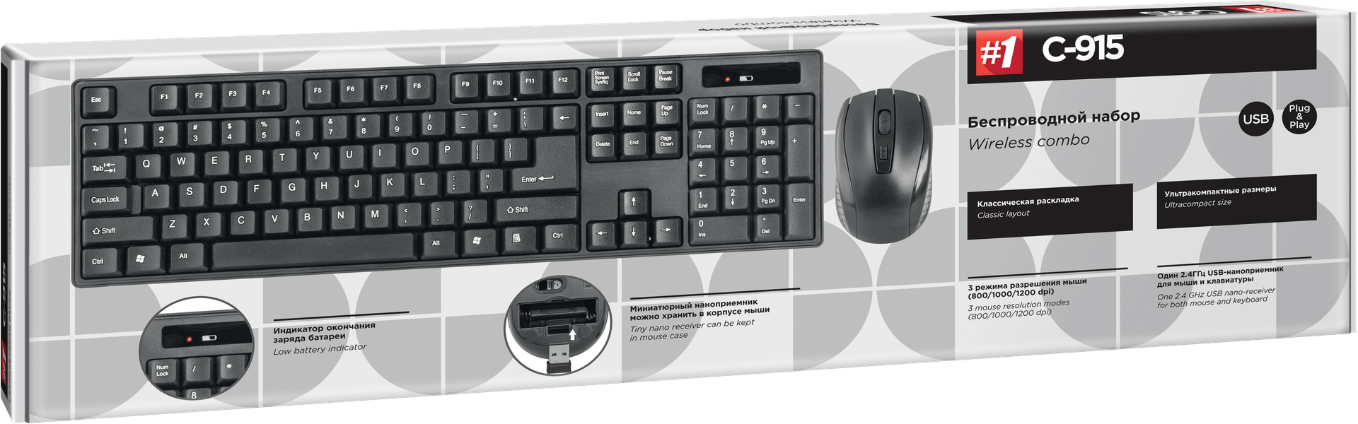 Интерфейс связи: Радио. Подключение к компьютеру: USB. Цветовое оформление клавиатуры и мыши: черный. Тип сенсора мыши: Оптический. Количество клавиш мыши: 4. Разрешение оптического сенсора мыши: 1200. Количество дополнительных клавиш клавиатуры: нет. Источник питания клавиатуры и мыши: 1 x AA (клавиатура), 2 х ААА (мышь). Время автономной работы (для беспроводных комплектов): 3-6 мес. Прочие особенности и свойства: Кнопка смены разрешения позволяет пользователю выбирать оптимальную скорость перемещения курсора. Индикатор над цифровым блоком заранее предупредит о скором окончании заряда батареи. Компактная клавиатура экономит пространство рабочего стола Удобная симметричная форма мыши. Классическая раскладка. Полноразмерная клавиша Enter. Цвета букв на клавишах клавиатуры: белый. Материал корпуса клавиатуры: пластик. Программируемые клавиши клавиатуры/мыши: нет. Прочие клавиши управления компьютером: н/д. Размеры, вес: 438 х 25 х 130 мм (клавиатура), 60 x 35 x 100 мм (мышь), 55 гр (мышь), 385 гр (клавиатура).