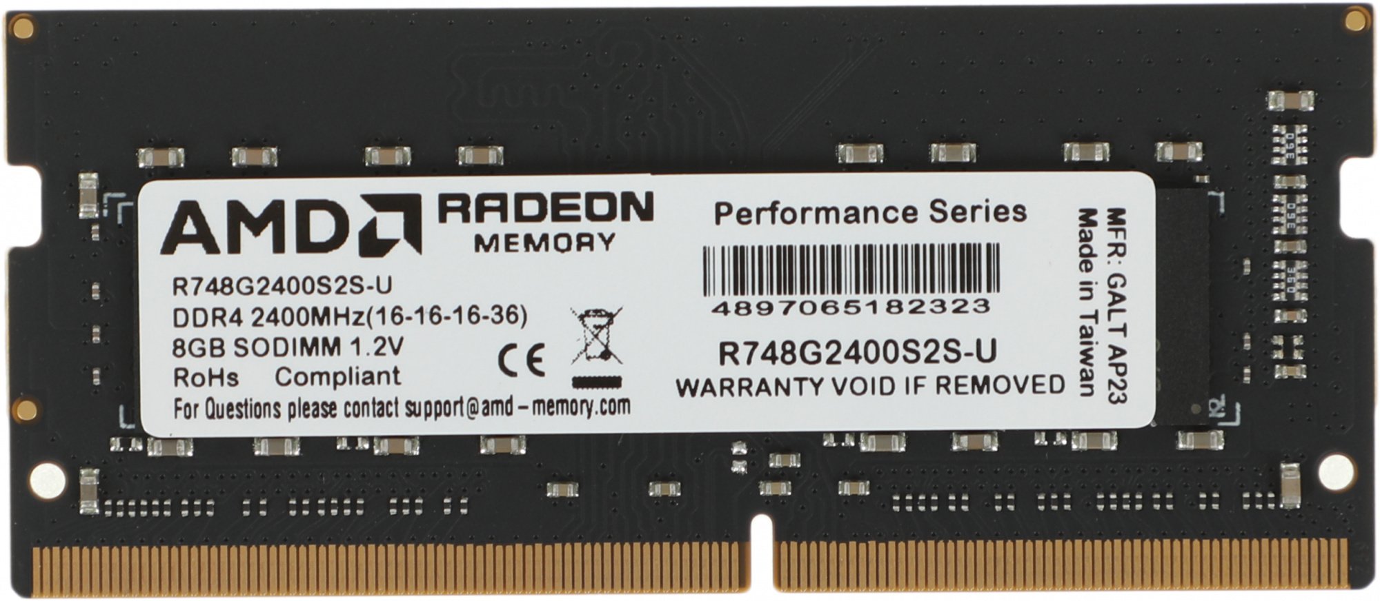 Оперативная память SODIMM AMD Radeon R7 Performance Series [R748G2400S2S-U] 8 ГБ отличается компактными размерами и подходит для монтажа в слот для ОЗУ на материнской плате ноутбука. Относясь к типу DDR4, такой модуль с полным объемом 8 ГБ имеет пропускную способность PC19200, тактовую частоту 2400 МГц. Память SODIMM может быть единственным модулем ОЗУ ноутбука или работать параллельно с еще одной такой же планкой, если мат. плата имеет два активных слота для подключения оперативной памяти. Конструктивно оперативная память SODIMM AMD Radeon R7 Performance Series [R748G2400S2S-U] 8 ГБ представляет собой печатную плату с основой из черного текстолита, на обеих сторонах которой расположены чипы памяти общим количеством 16 штук. Рабочее напряжение, в котором нуждается память для работы, составляет 1.2 В. Планка помещена в фирменный полупрозрачный блистер из пластика.