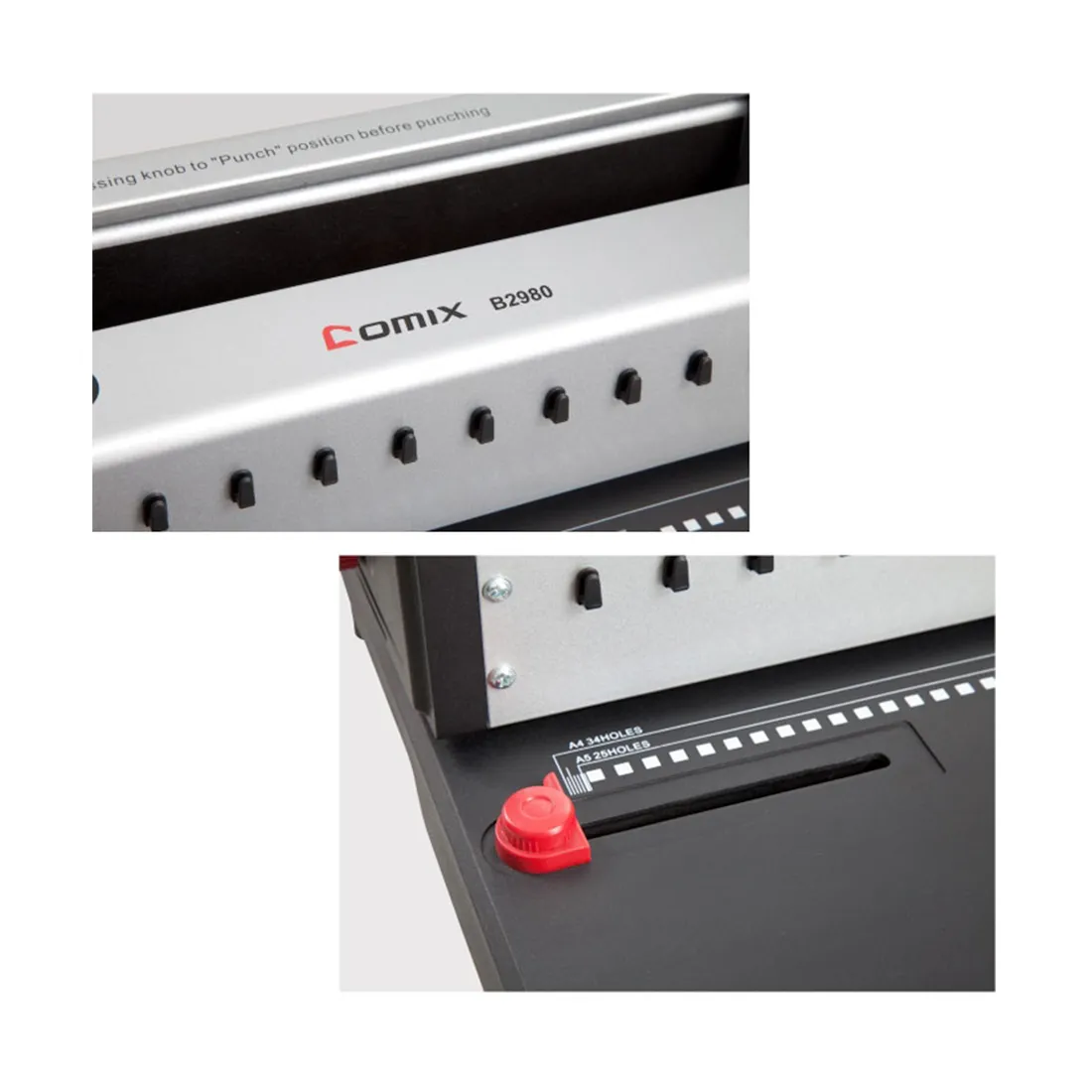 Брошюровщик Comix B2980, с регулировкой формата и глубины пробивки. Максимальное количество листов для переплета 120л., перфорация 15 листов за один раз.