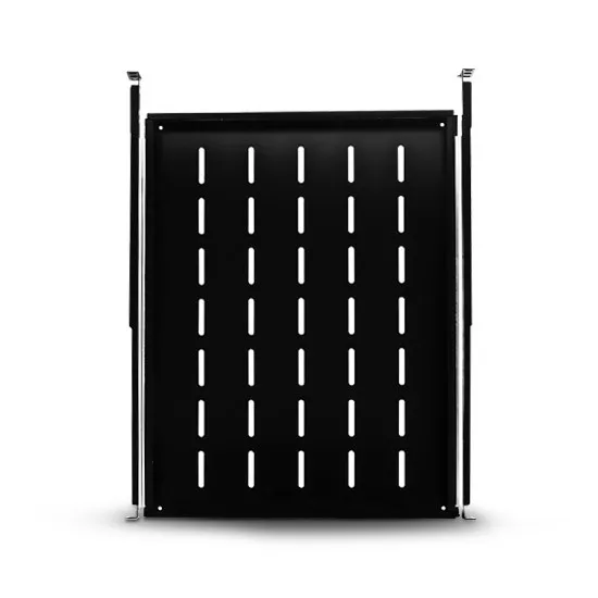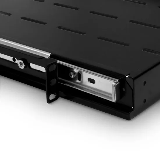 Полка имеет телескопические направляющие, обеспечивающие плавное выдвижение. Монтажные кронштейны фиксируют полку к вертикальным направляющим шкафов и стоек в четырех местах. Глубина монтажных кронштейнов регулируется, что позволяет устанавливать полку на необходимую глубину. Полка перфорирована для свободного прохождения охлаждающего воздуха.