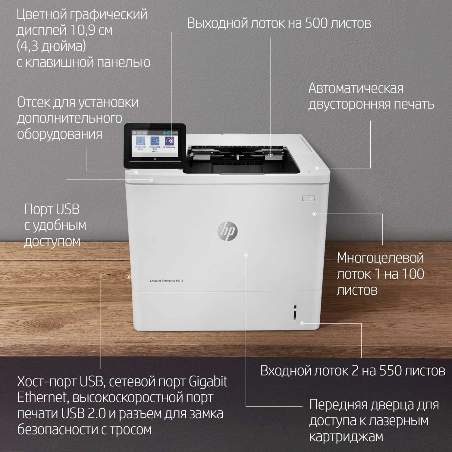 Принтер лазерный HP LJ Enterprise M611dn 7PS84A, A4, 1200x1200 dpi, 61 ppm, Ethernet, USB 2.0