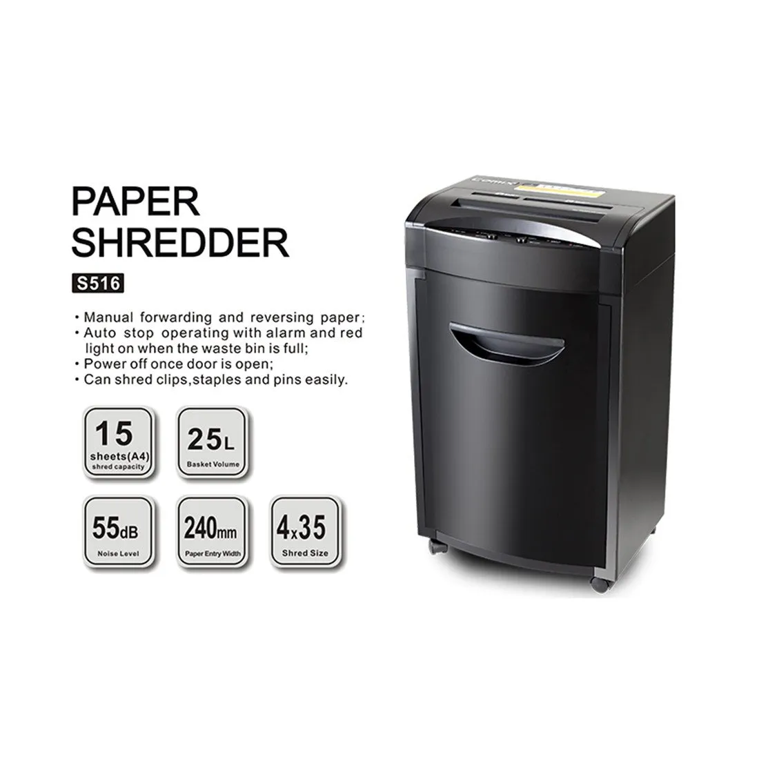 Надёжный и функциональный шредер COMIX S516 — идеальное решение для безопасного уничтожения документов, кредитных карт и оптических дисков как в офисе, так и дома. Эффективная перекрёстная резка и продуманный дизайн обеспечивают высокую производительность и удобство эксплуатации.