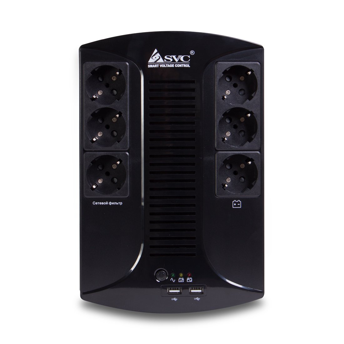 Линейно-Интерактивный ИБП с функцией сетевого фильтра SVC U-650-L Устройство, позволяющее подключённому оборудованию некоторое время работать от встроенных аккумуляторов, при пропадании электрического тока или при выходе его параметров за допустимые нормы. 3 выходных разъёмов Shuko CEE7 с батарейной поддержкой и 3 выходных разъёмов с функцией сетевого фильтра позволят подключить большое количество оборудования. 2*USB порта 5В/2А позволят зарядить любое портативное устройство.
