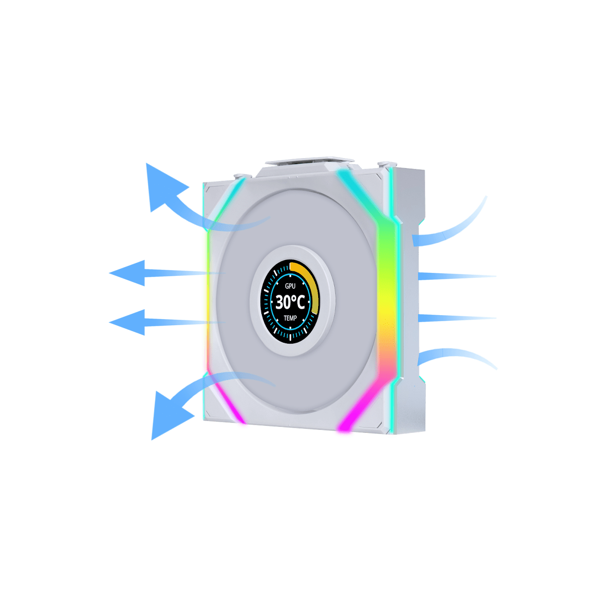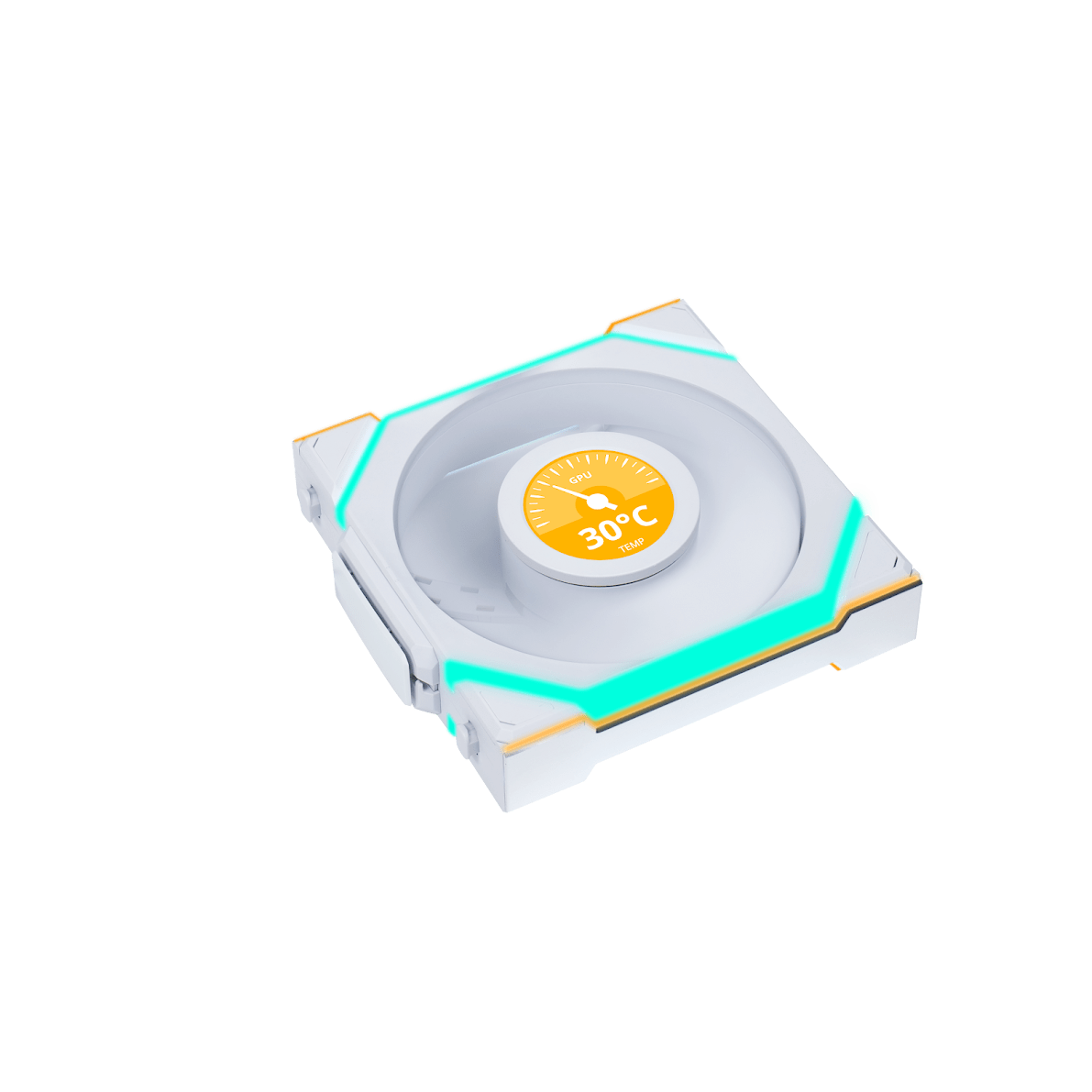 Lian Li 12TLLCD1W1B — это вентилятор из серии UNI FAN TL LCD Wireless, представляющий собой 120-мм модель с уникальным 1,6-дюймовым LCD-экраном в центре. Он поддерживает беспроводную синхронизацию через сигнал 2,4 ГГц для управления скоростью вращения (350–1900 об/мин) и RGB-подсветкой с помощью ПО L-Connect 3. Оснащён двумя зонами подсветки с эффектом бесконечного зеркала и лопастями из жидкокристаллического полимера (LCP) для высокой производительности (до 62 CFM) и низкого уровня шума (27 дБА). Поддерживает систему соединения UNI FAN для удобного управления кабелями. Выполнен в белом цвете, контроллер в комплект не входит и приобретается отдельно. Экран позволяет отображать системные данные или пользовательские изображения/анимации.