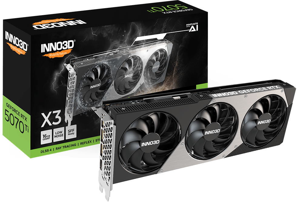 INNO3D® GEFORCE® RTX™ 5070 Ti X3. Серия INNO3D GeForce RTX 50 обещает исключительную производительность этих видеокарт нового поколения на базе архитектуре Blackwell от NVIDIA. INNO3D GeForce RTX 5070 Ti X3 OC предвещает новую эру в графических технологиях, устанавливая новый стандарт производительности. X3 OC не ограничивается только мощностью, его потрясающий дизайн органично сочетает форму и функциональность. Это идеальное сочетание эстетики и передовых технологий принесло компании INNO3D широкое признание, укрепив ее статус пионера в области графических инноваций.