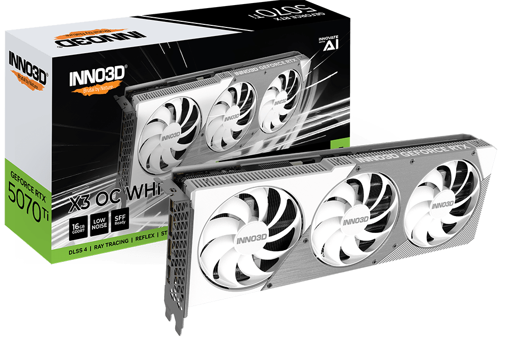 INNO3D® GEFORCE® RTX™ 5070 Ti X3. Серия INNO3D GeForce RTX 50 обещает исключительную производительность этих видеокарт нового поколения на базе архитектуре Blackwell от NVIDIA. INNO3D GeForce RTX 5070 Ti X3 OC предвещает новую эру в графических технологиях, устанавливая новый стандарт производительности. X3 OC не ограничивается только мощностью, его потрясающий дизайн органично сочетает форму и функциональность. Это идеальное сочетание эстетики и передовых технологий принесло компании INNO3D широкое признание, укрепив ее статус пионера в области графических инноваций.