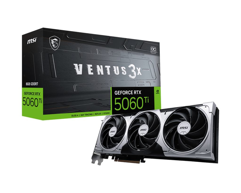 MSI GeForce RTX 5060 Ti 8G VENTUS 3X OC — видеокарта на архитектуре NVIDIA Blackwell с 8 ГБ памяти GDDR7 (128-бит, 28 Гб/с). Оснащена тройной системой охлаждения с вентиляторами TORX Fan 5.0 для улучшенного воздушного потока и тихой работы. Поддерживает полную трассировку лучей, DLSS 4 с ИИ для повышения FPS и качества изображения, а также Reflex 2 для снижения задержек. Частота ядра: до 2617 МГц (MSI Center). Интерфейс PCIe 5.0, выходы: 3x DisplayPort 2.1b, 1x HDMI 2.1b (до 4K 480 Гц или 8K 120 Гц). Поддерживает MSI Afterburner и MSI Center для разгона и мониторинга.