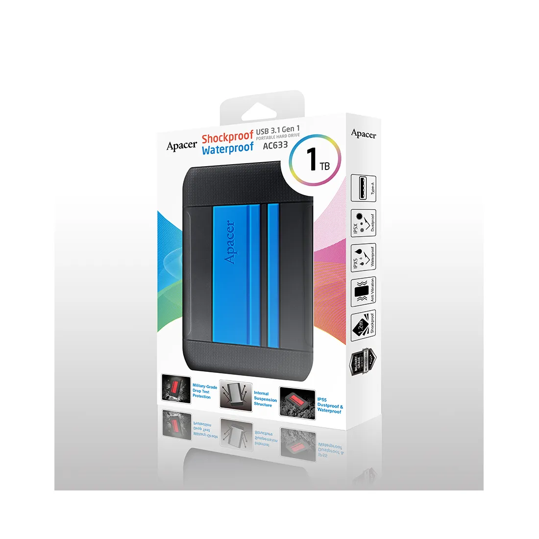 Независимая внутренняя подвеска снижает вибрации и минимизирует удары, вызванные случайными падениями. Противоударная защита военного класса, AC633 прошел тест MIL-STD-810G 516.6. Процедура IV (испытание на падение). Это означает, что хранящиеся данные не повреждаются при случайном падении с высоты 1,22 метра. Превосходное резиновое покрытие AC633 может противостоять попаданию воды и пыли. В пыли или дожде, он может легко справиться со своими задачами. AC633 использует прочный разъём USB Type-A, который прошёл проверку на 10 000 включений/отключений, тем самым обеспечивая гарантию безопасности для пользователей. Скорость передачи данных AC633 достигает 5 Гбит/с. Преимущество во времени резервного копирования и передачи большого количества аудио- и видеофайлов.